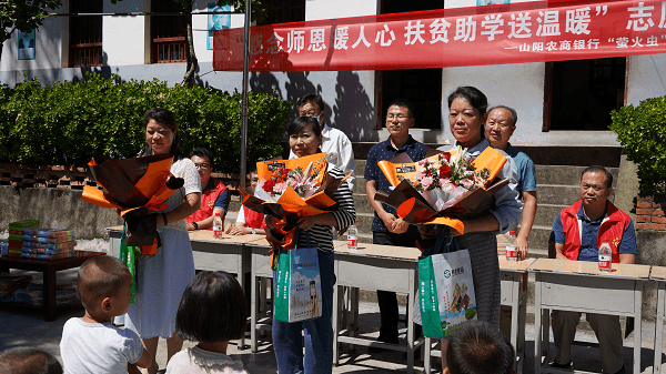活动中,二年级小学生首先代表全体同学为三位老师送上了节日祝福,用朴实的语言感谢老师们的辛勤付出和对他们的深厚关爱,所有的词语无不道出了孩子们的感激之情。郭礼峰、洪涛、徐世炳等同志分别代表商行党委、漫川关镇党委、康家坪村两委为老师们赠送了鲜花和生活用品,全体学生也送上了提前制作好的贺卡,把满满的祝福亲自送到心爱的老师手中。随后,“萤火虫”志愿服务队向全体学生赠送书包、文具盒、钢笔、彩笔等学习用品,学生们排着整齐的队伍依次上台双手接过赠予的物品,一个个脸上都洋溢着幸福的笑容,纷纷对志愿队的爱心表达了感谢。活动最后,洪镇长代表漫川关镇党委政府对山阳农商银行此次志愿服务活动表示了感谢,教导孩子们一定要牢记山阳农商银行的关爱和支持,不忘恩情,勤奋学习,争做对家乡有用、对社会有益的栋梁之才,同时希望山阳农商银行能在贫困村多组织、多开展志愿服务活动,进一步推动和加强新时代文明实践活动建设工作,助力打赢脱贫攻坚战。