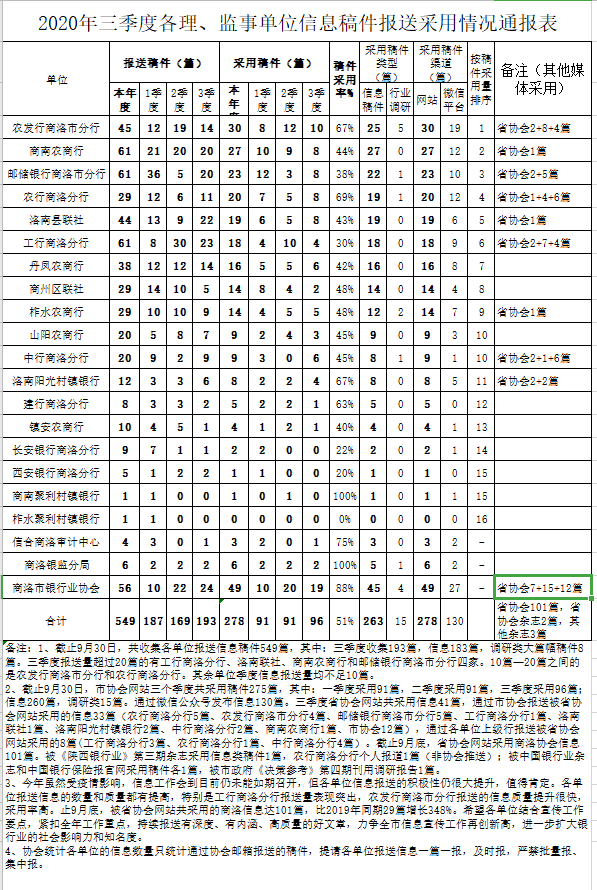 2020年三季度各理、监事单位信息稿件报送采用情况通报表