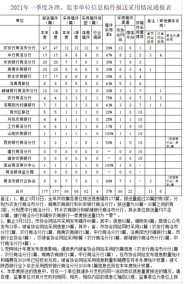 2021年一季度各理、监事单位信息稿件报送采用情况通报表