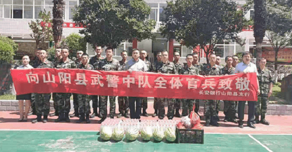 7月30日,在中国人民解放军建军94周年即将来临之际,长安银行山阳县支行深入山阳县武警中队,开展“八一慰问暖人心 致敬最可爱的人”军营拥军优属活动,用实际行动向武警战士致以节日的祝福和问候,并送来了矿泉水、西瓜水果等解暑物资,畅叙鱼水情谊,向武警官兵致敬。
