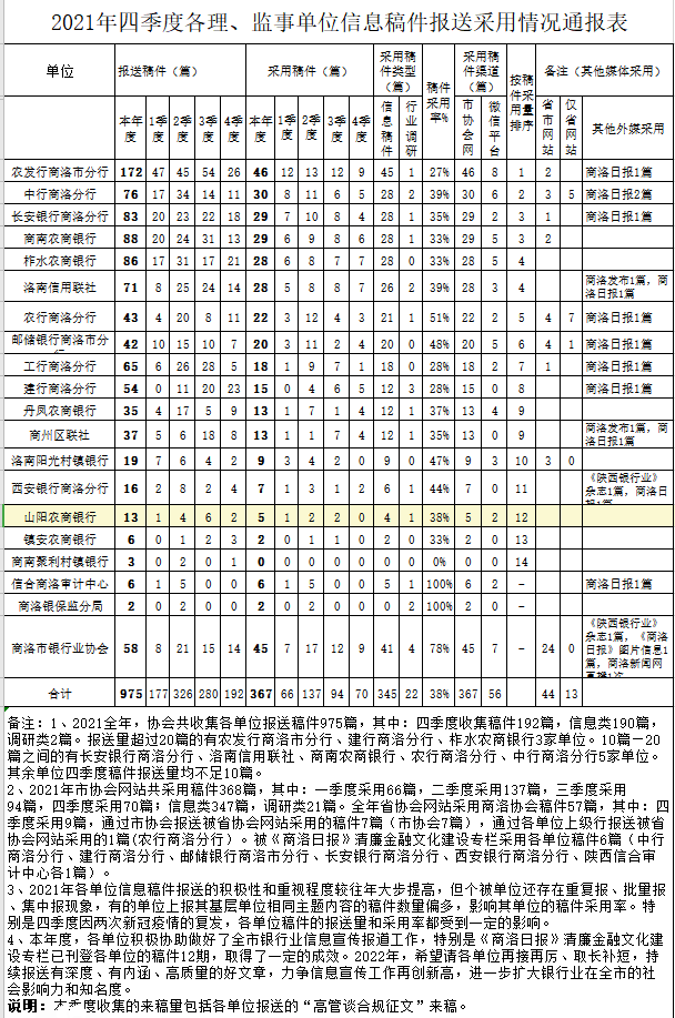 2021年四季度各理、监事单位信息稿件报送采用情况通报表