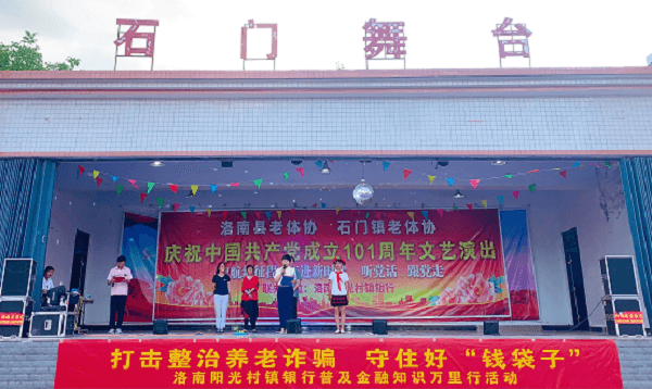 2022年6月28日下午,洛南县老年人体育协会牵头举办的“庆祝中国共产党成立101周年文艺演出”活动在洛南县石门镇文化站举行,此次文艺演出,主办方邀请了石门、石坡、巡检等乡镇民间老年人艺术团体同台表演,为建党101年周年献礼。我行作为联办单位,组织石门支行及南门口支行9名员工参与了本次活动。