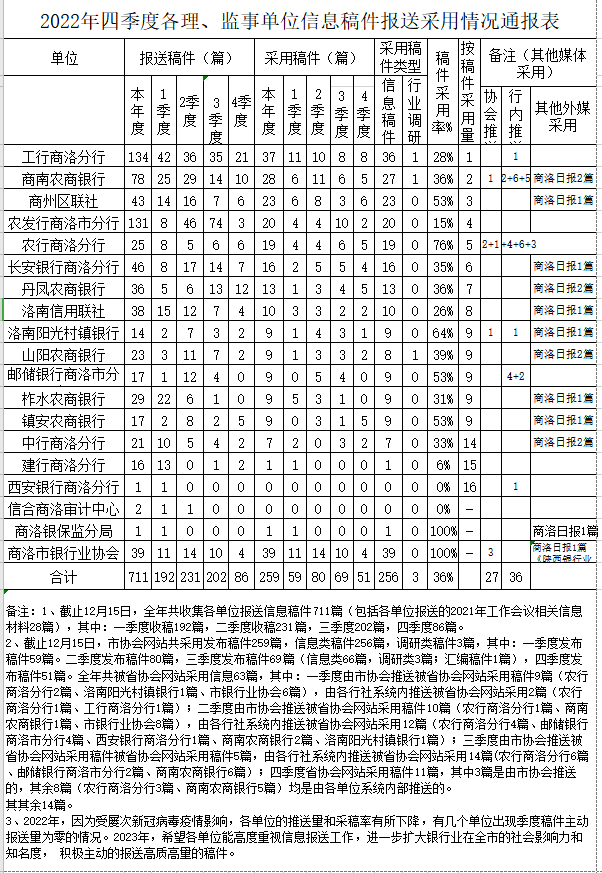 2022年四季度各理、监事单位信息稿件报送采用情况通报表