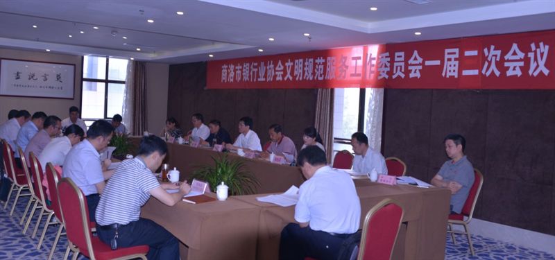 商洛市银行业协会文明规范服务工作委员会一届二次会议于2017年6月16日在商洛市欣源国际大酒店顺利召开。会议由十五家理事单位选举产生的16位文明规范服务工作委员会委员及协会产生的一名委员参加了。商洛市银行业协会专职副会长从厚宏、副秘书长张辉指导了会议。会议由当选的第一届主任委员—中国农业银行商洛分行副行长王德民主持,全天的会议在紧张、严肃、团结、向上的气氛中完成了五大项安排议程;会议讨论并通过了《商洛市银行业文明规范服务工作指引》、《商洛市银行业年度“十大优秀基层支行长”、“十大明星大堂经理”评选活动方案》(审议稿)及“2017年度商洛市银行业协会文明规范服务工作指导意见”等;会上还邀请北京嘉泰开元公司刘老师对今年一季度所做的八十家全市银行业机构网点的服务暗访情况进行了通报并做了服务规范的指导性培训。