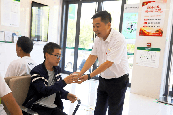 在洛南县支行网点大堂,谢峰行长佩戴党徽和工牌在网点当起了大堂经理,参与客户引导、分流和厅堂服务等日常工作,落实“厅堂一杯水”的服务理念,亲切为大厅等候办理业务的客户递上热水,与前来办理业务的客户详细交流,认真倾听客户声音,了解客户金融需求,关注客户满意度,了解客户金融服务需求情况。通过发挥"领头雁"作用,引领广大党员干部转变工作作风,强化担当作为,掀起主动服务、热情服务、用心服务的热潮。