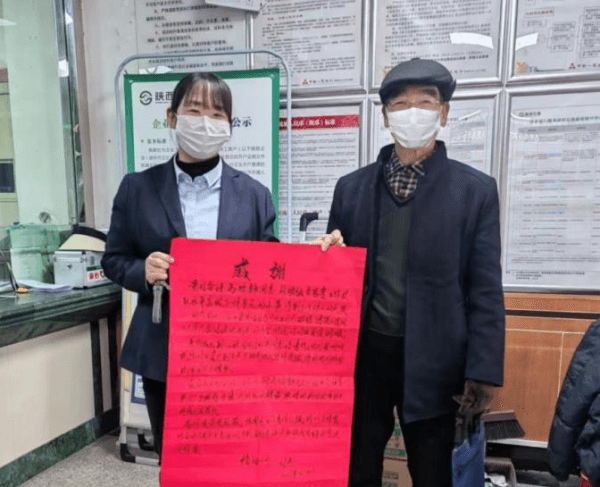 这原本是柜台办公常遇到的小事,柜员小马并没有放在心上,没曾想过了几天付大爷带着一份手写的大字报专程来表示感谢,现场表扬让营业大厅里热闹非凡,周围办理业务的群众纷纷表示赞许,营业厅内充满了热闹祥和的氛围,也让寒冷的冬日里传递了更多温暖。