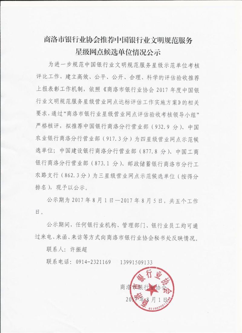 商洛市银行业协会推荐中国银行业文明规范服务 星级网点候选单位情况公示