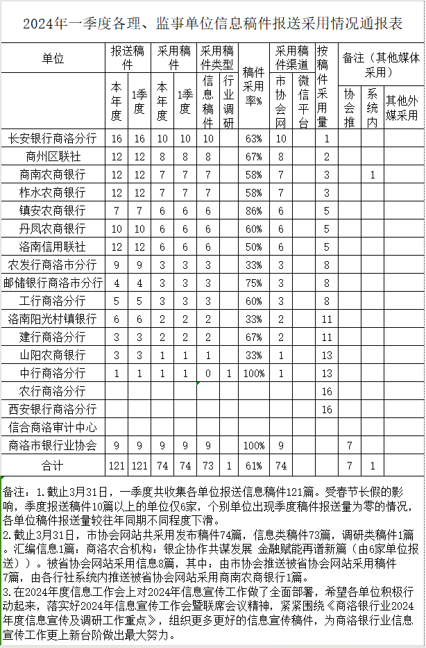 2024年一季度各理、监事单位信息稿件报送采用情况通报表