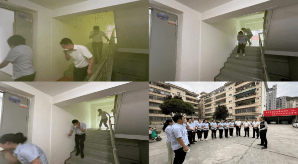 随后开展了应急疏散演练。在办公区走廊,李警官讲解了火灾发生初期的逃生要点、毛巾的正确使用方法和相关注意事项。随着消防警报响起,浓烟滚滚,消防应急疏散演练拉开了帷幕,全体员工手捂口鼻,有序弯着腰、扶着楼梯快速从三楼安全通道向一楼安全区域撤离。演练结束后,员工分享了切身感受,李警官对逃生过程发现的问题进行了指导提示。