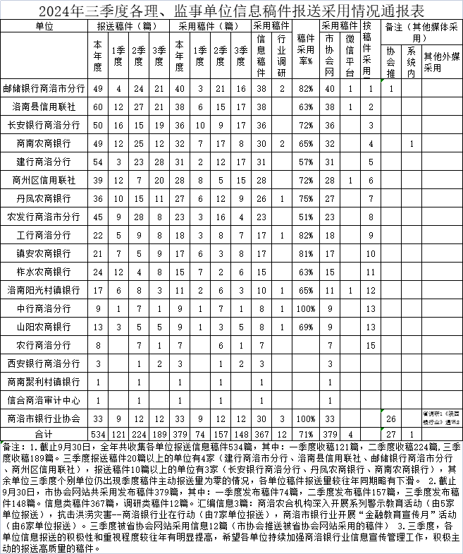 2024年三季度各理、监事单位信息稿件报送采用情况通报表