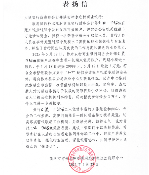 近日,柞水农商银行成功拦截一起3万元的涉诈资金流转事件,生动诠释了警银协同作战的强大效能,彰显了柞水农商银行作为地方金融机构的社会责任担当。