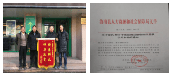 辛勤付出赢赞誉。邮储银行洛南县支行的扶贫工作得到了省、市分行的肯定,陶岭社区领导和群众的认可,社会各界的好评,他们认为该支行扶贫工作抓的实、抓的细,有特点、有亮点,为社区扶贫工作注入了真情,献出了爱心。陶岭社区被洛南县人力资源劳动保障局命名为“创业担保贷款信用乡村”,洛南县支行被邮储银行商洛市分行授予“金融扶贫先进集体”,陶岭社区专程给洛南支行送来了锦旗,感谢该行的包村帮扶工作。