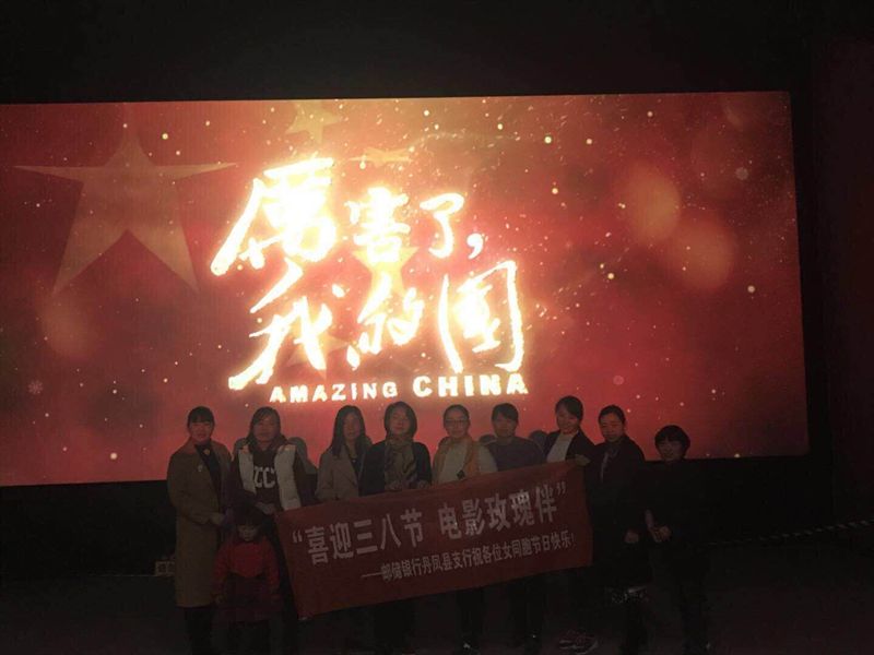 丹凤县支行组织女职工观看"厉害了 我的国",在这美好的日子里,为广大女职工送上精神食粮,祝愿祖国繁荣昌盛,祝愿邮储人激情常在,青春永驻。