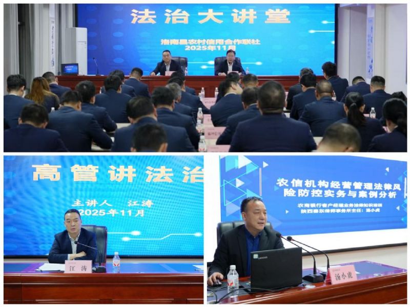 会上,联社党委副书记、主任江涛作了《以法治之力护航高质量发展》的“高管讲法治”专题讲座。他强调,2025年是合规管理效能提升三年规划“重点突破年”,法治是联社行稳致远的“根”与“魂”,并提出四点核心要求:一是提高政治站位,深刻认识“法治是金融机构最根本的生命线” ,从政治大局、监管要求和自身发展维度阐明法治建设的重要意义;二是直面突出问题,清醒认识“法治短板仍是高质量发展的最大隐患” ,指出当前信贷合规缺失、反洗钱基础薄弱、法治意识淡薄等关键问题;三是聚焦关键环节,以“四个强化”推动法治建设走深走实 ,通过强化顶层设计、信贷合规、反洗钱内控管理和法治文化培育筑牢法治屏障;四是压实责任担当,以“头雁效应”带动“全员守法” ,明确负责人、干部员工的责任及审计监督的严格举措。