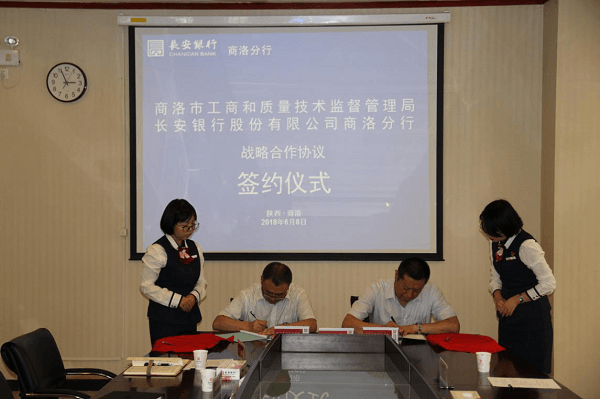 2018年6月8日,长安银行商洛分行与商洛市工商和质量技术监督管理局签订《战略合作协议》,并围绕“提升营商环境、改进服务质量、密切政银合作”的主题进行了交流座谈。商洛市工商和质量技术监督管理局副局长国学炜、注册分局局长高珍、长安银行商洛分行副行长李贵波及相关部门负责人和客户经理(大堂经理)参加了本次活动。