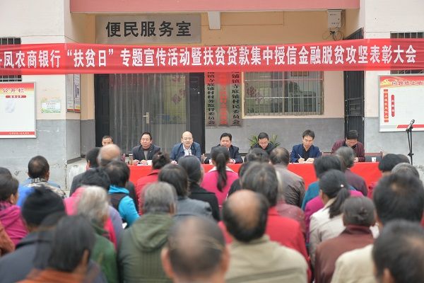 这一天,丹凤农商银行在包扶的贫困村铁峪铺镇寺底铺村召开丹凤农商行“扶贫日”主题宣传及集中授信金融脱贫攻坚表彰大会,铁峪铺镇党委书记周忠海、副镇长闫钊和寺底铺村两委会成员以及200余名群众参加了现场活动。农商行行长刘武在会上讲话,通报了丹凤农商行在驻村包扶脱贫攻坚工作中的举措、存在的问题和取得的成效。并强调,丹凤农商行保证包扶人员力量不减、投资力度不减、金融扶持政策不变,坚决落实好“不断贷、不抽贷、不压贷”,一如既往助力未脱贫户发展产业脱贫;希望广大村民树立“劳动光荣”“致富光荣”“脱贫光荣”的思想观念,坚定信心和决心,增强内生力和技能水平,积极发展产业,诚实劳动和经营,早日脱贫致富。会上,丹凤农商行对3名优秀驻村干部和3户脱贫致富先进代表现场表彰,树立典型;现场为铁峪铺辖内有信贷需求且符合扶贫贷款发放条件的15户贫困户进行集中授信,每名授信5万元小额扶贫贷款,同时,现场发放传单等资料,宣传扶贫政策及金融知识。