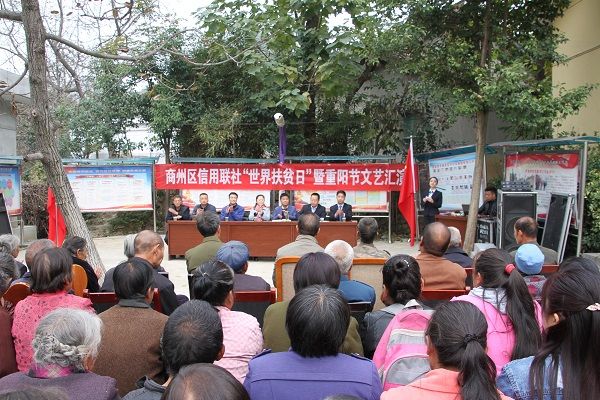 这一天,商州区信用联社在包扶的金陵寺西窑村举办了“世界扶贫日”暨重阳节文艺汇演,本次文艺汇演的所有节目均由商州联社职工自编自演,内容丰富,形式多样。歌曲《不忘初心》《为了谁》让现场观众热泪盈眶,诗歌朗诵《牢记使命心系三农 商州信合再创辉煌》体现了商州信合人不忘初心、牢记使命、扎根三农、金融脱贫攻坚的坚定信心,街舞《Good Boy》、吉他弹唱《乌兰巴托的夜》、相声《满腹经纶》、单簧管独奏《天空之城》、合唱《为了谁》、戏歌《黄梅戏》等精彩节目使现场掌声彼伏、笑声不断,演出氛围分外浓郁。观看演出的近百名群众和区、镇、审计中心的领导,均给予了很高的评价。“这一天像过年看春节联欢晚会一样,热闹。”,“信用社职工多才多艺,不简单”。当地,金陵寺镇卫生院医务人员也助兴为群众义务测血糖、量血压。