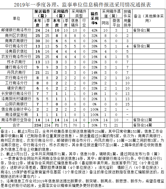 2019年一季度各理、监事单位信息稿件报送采用情况通报表