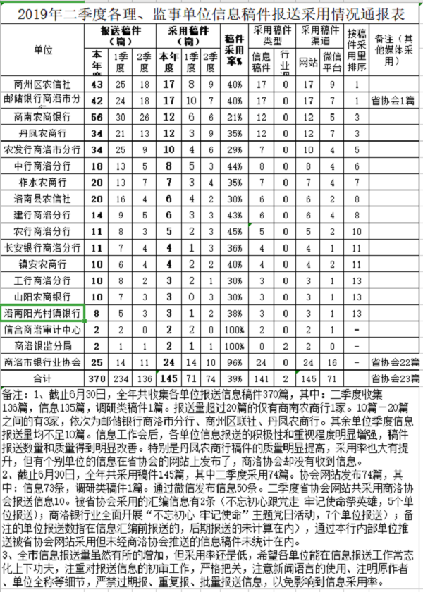 2019年二季度各理、监事单位信息稿件报送采用情况通报表
