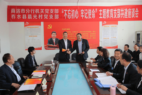 “农村要发展,农民要致富,关键靠支部。”“农村基层党组织是党在农村全部工作和战斗力的基础,是贯彻落实党的扶贫开发工作部署的战斗堡垒。”这是习近平总书记在河北省阜平县考察扶贫开发工作时的讲话。为进一步增强定点帮扶村“四支队伍”的战斗力,凝聚全面助力柞水县杏坪镇晨光村打赢脱贫攻坚战的合力,2019年9月29日,农发行商洛市分行机关党支部与帮扶的柞水县杏坪镇晨光村党支部开展了“不忘初心、牢记使命”主题教育支部共建座谈会。