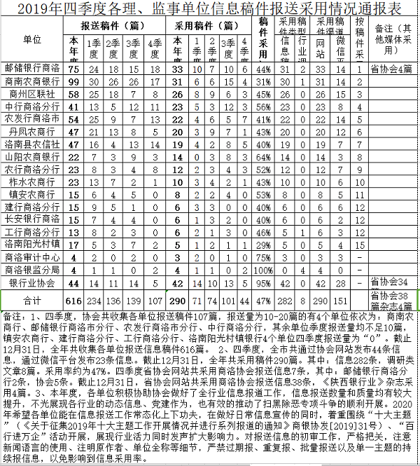 2019年四季度各理、监事单位信息稿件报送采用情况通报表