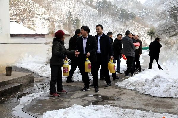 与昨年不同的是,贫困百姓受积雪困扰,考虑在村部集中发放慰问年货途中路滑不安全,统一由农商银行驻村扶贫工作人员将米面油送到每一个贫困户家中。