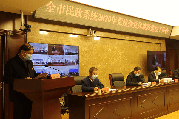 市民政局党组书记、局长张彦锋在会议中带领大家深入学习贯彻落实习近平新时代中国特色社会主义思想及中省市关于党建暨党风廉政建设相关会议精神。总结了2019年全市民政系统社会组织党建、机关党建和党风廉政建设工作,安排部署了2020年工作任务。