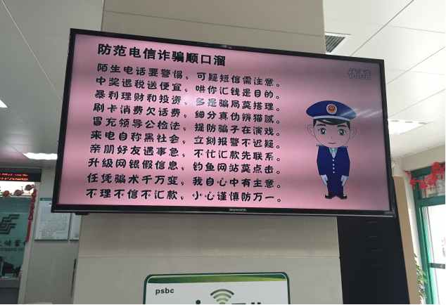 邮储银行商洛市分行于2016年1月18日至22日,以营业网点为阵地,针对本地区、本行业高发多发的电信诈骗规律特点,开展了有声有色的“防范电信诈骗网络新型违法宣传周”活动,通过厅堂讲解、散发传单、在LED显示屏植入警示标语、播放卡通宣传片、编写防骗口诀、以案说法、摆摊设点举办主题宣传日等形式广泛全方位宣传,揭露犯罪分子的诈骗手段,提高群众防范意识。