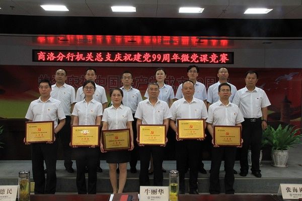 农行商洛分行在7月1日当日,召开庆祝建党99周年大会,会上,分行党委书记牛丽华同志以《立足岗位 奋发有为 以新理念新作风推动商洛农行高质量发展》为题,给全体党员讲授了一堂生动的党课。分行机关党总支还开展了讲党课竞赛活动,评选出一、二、三等奖六名,并为获奖党支部颁发了奖牌。