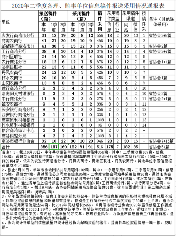 2020年二季度各理、监事单位信息稿件报送采用情况通报表