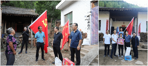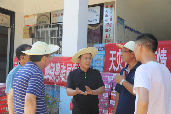 8月9日,骄阳似火,道路泥泞,邮储银行商洛市分行行长王涛一行赶到扶贫村,慰问受灾群众及抗洪抢险人员,给他们送去面粉、方便面、矿泉水等防汛生活物资,为陶岭社区的灾后重建注入邮储力量,并与社区党支部书记、驻村第一书记一同了解灾情,查看受灾情况。