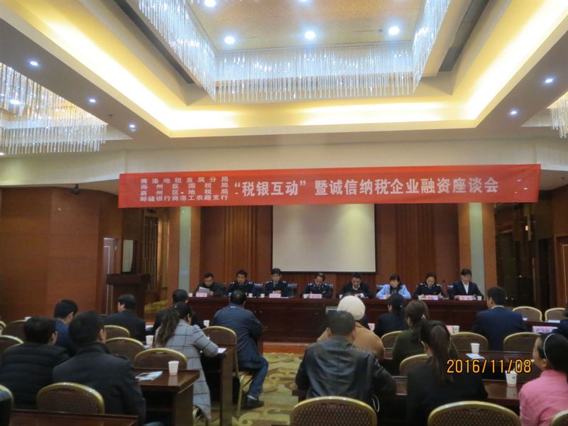 为进一步搭建政银企合作平台,谋求多赢互动突破发展,邮储银行商洛市工农路支行于11月8日下午在商洛天地仁和酒店八楼会议室成功举办了“税银互动”暨诚信纳税企业融资座谈会。商洛市银监分局、邮储银行商洛市分行、商洛市地方税局直属分局、商州区国家税务局、商州区地方税局、商州区政府金融办、商洛市工农路支行等相关领导以及B级以上诚信纳税企业代表约50人参加了会议。